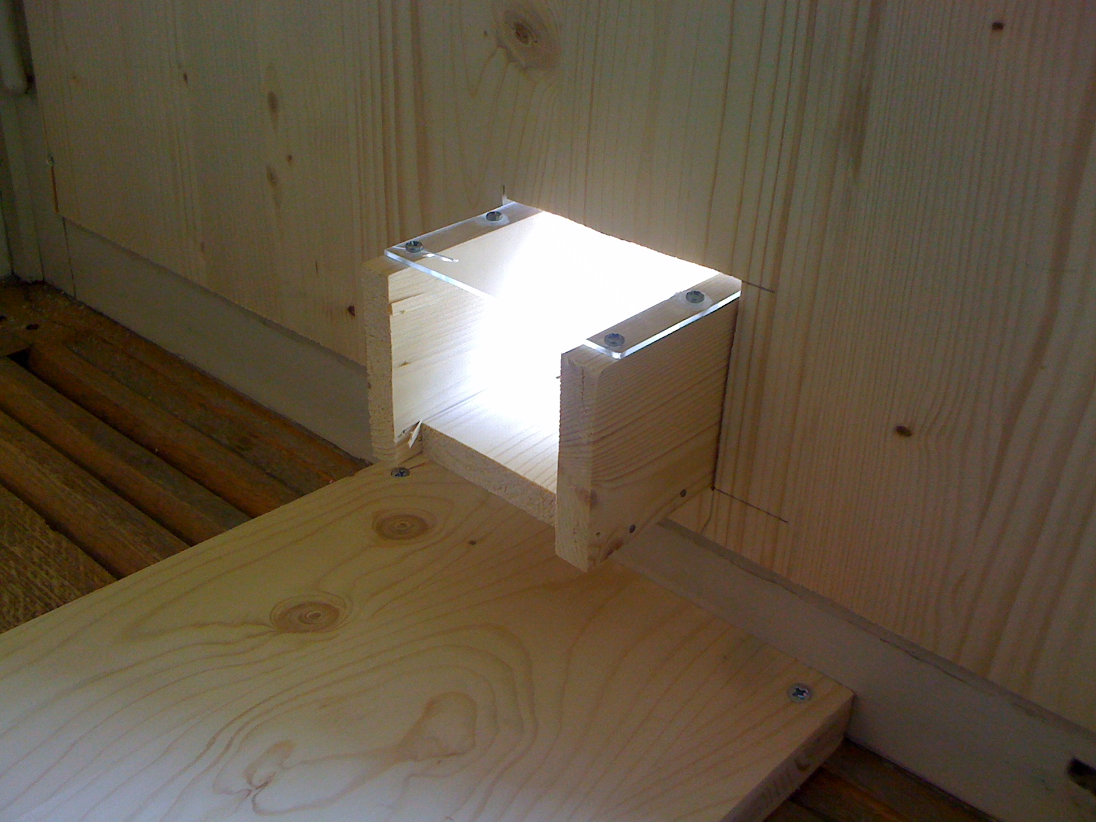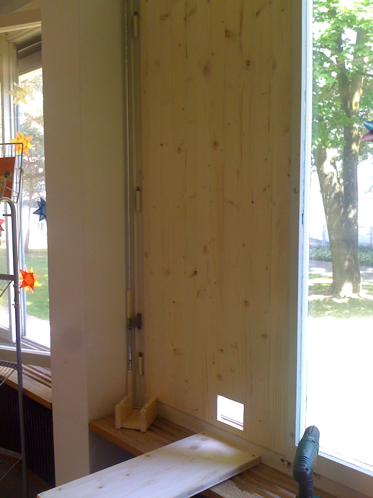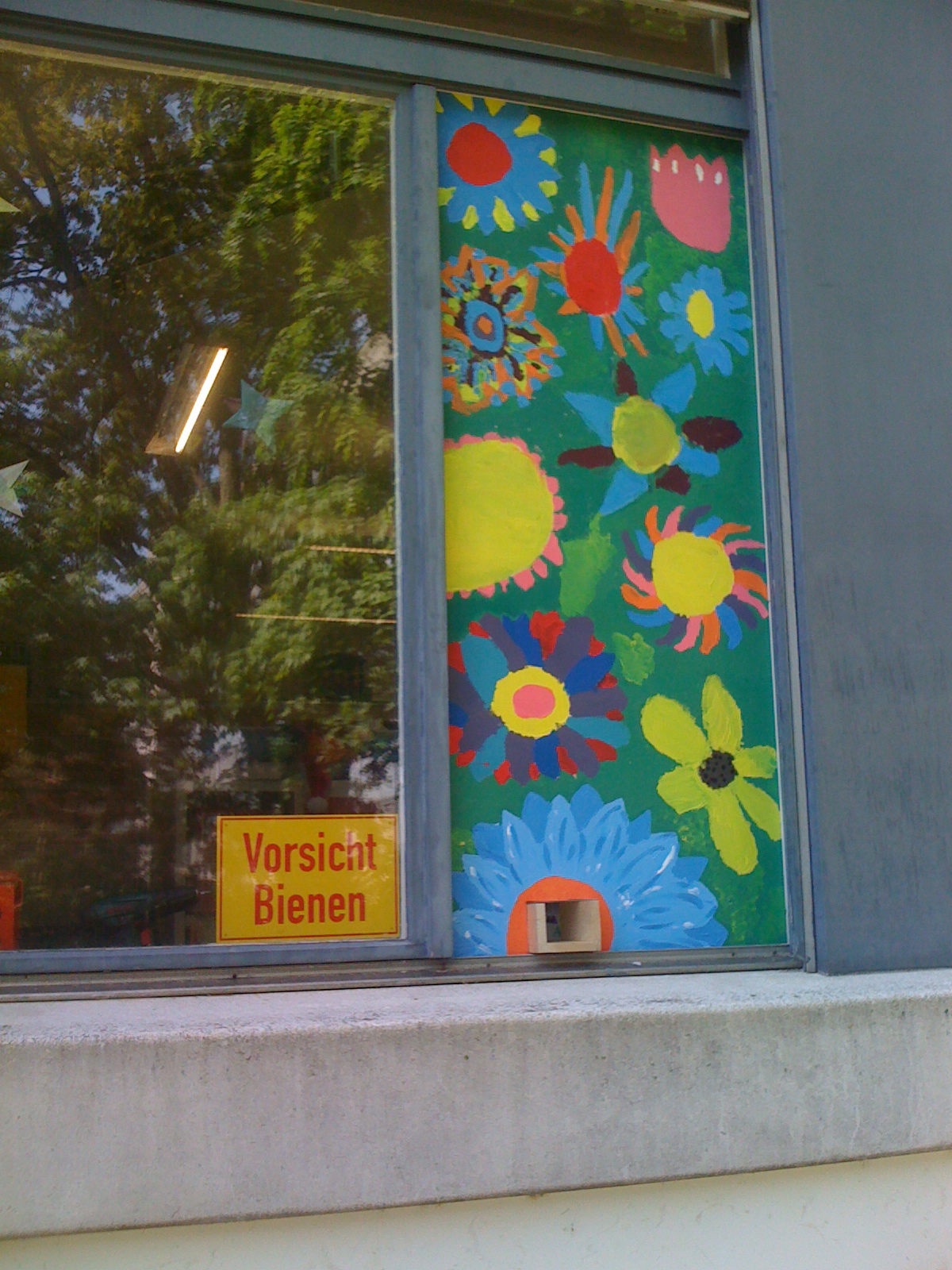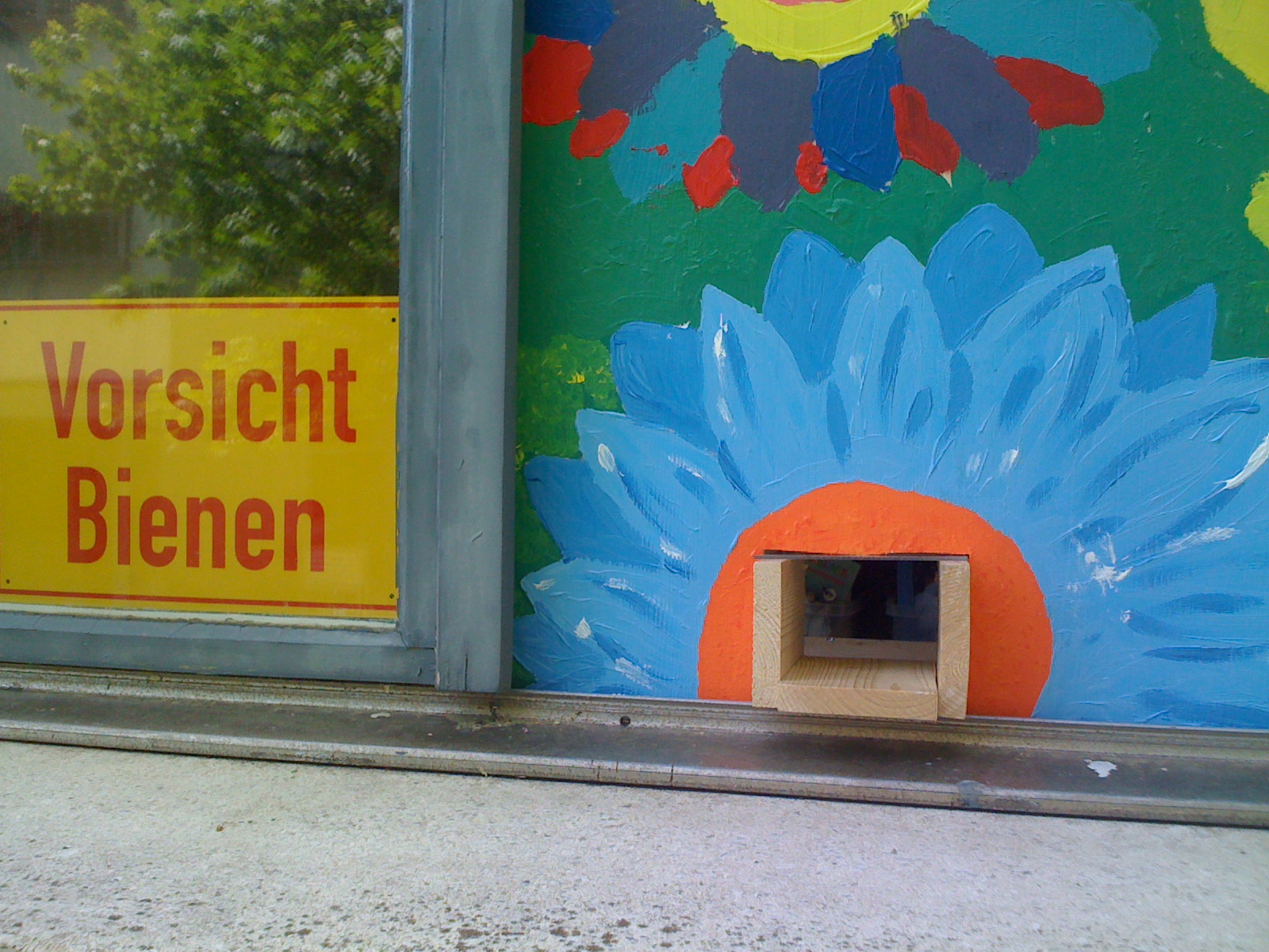 Fenster durch ein Brett ersetzen mit einem Flugloch auf der richtigen Höhe. Das Brett kann mit den Kinder bunt bemalt werden und dient den Bienen zur Orientierung.