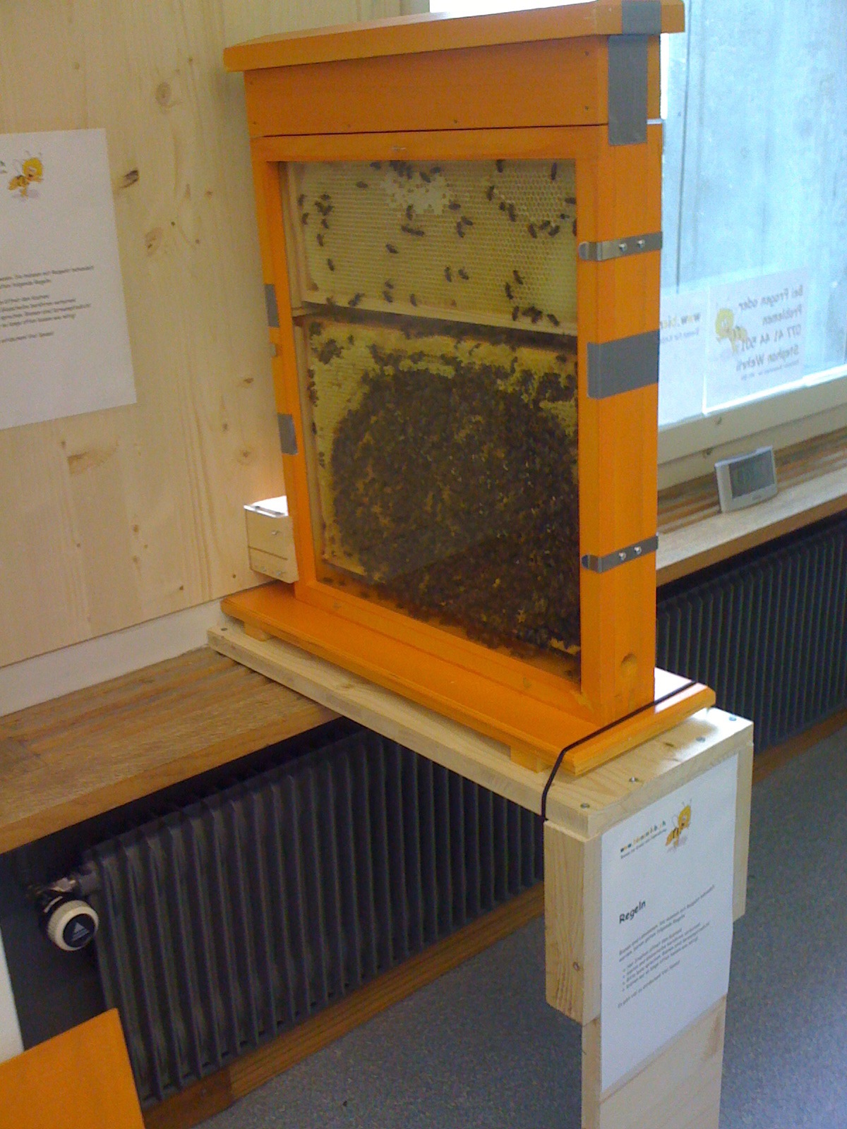 Wenn Sie die Bienen im Unterricht behandeln, sei dies in geführtem Unterricht oder auch in einer Werkstatt, ist es sehr bereichernd, wenn Sie einen Schaukasten in ihrem Schulzimmer aufstellen. Die Installation ist nicht ganz einfach und braucht einige Vorarbeiten, damit der Kasten stabil steht, die Arbeit lohnt sich aber, weil die Kinder die Verhaltensweisen der Bienen im Innern des Bienenstockes beobachten können. Insbesondere kann man die Aufzucht einer jungen Königin mitverfolgen.